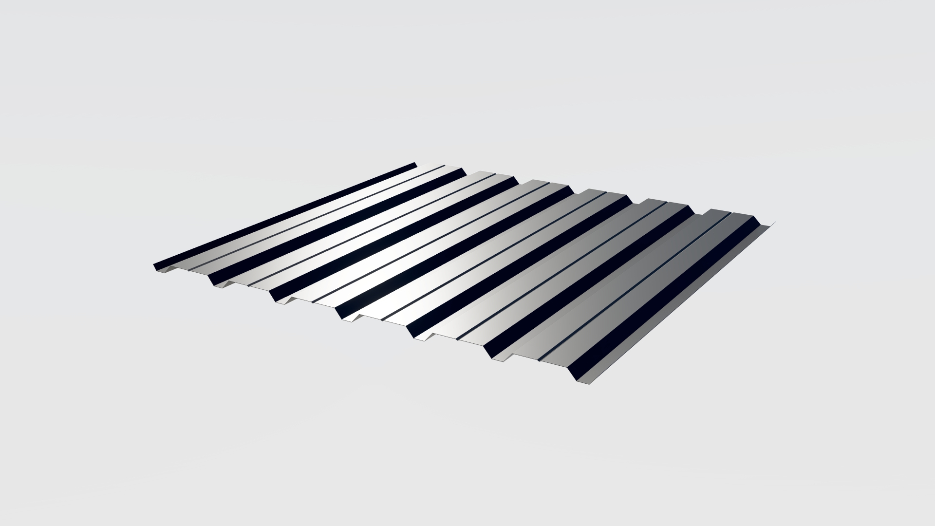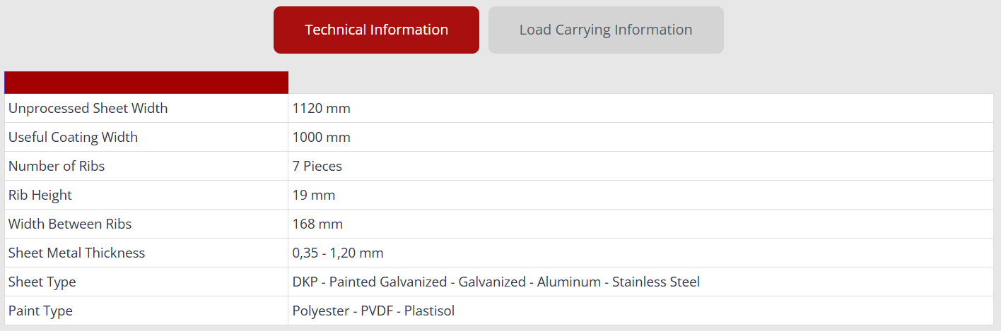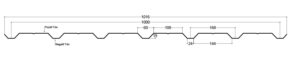 19/168-1000 corrugated sheet form; has 7 ribs with 19 mm height, 168 mm rib distance and 1000 mm cover width. It can be produced from the materials Carbon Steel, Prepainted Galvanized Steel (PPGI), Galvanized Steel (GI), Stainless Steel (St.S) and Aluminium; and generally preferred for facade cladding due to the high number of ribs and low rib height as well as preferred for roofing sublayer where purlin spacing is low.
