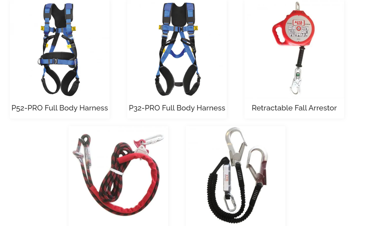 Personal protective equipment in the Alya Archi product range: full body harness, adjustable length lanyard, double arm lanyard, retractable fall arrestor.